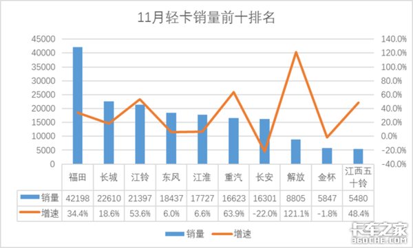排名前十轻卡企业中,前七名销量均破10000台,其中福田销量42198台位居榜首,遥遥领先于第二、三名,优势明显。