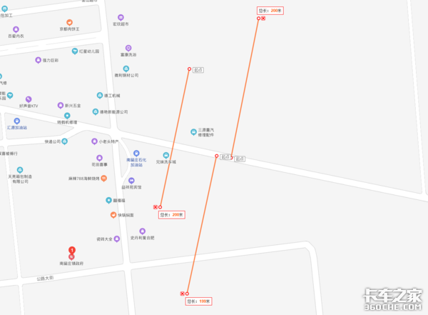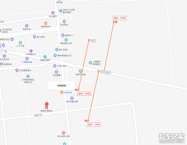 我们尝试用卫星地图,在蔚县南留庄附近的省道上测量了一下200米的范围。作为对比,图中停放的挂车能够清晰的显示出,可200米的区域范围有如此之大。