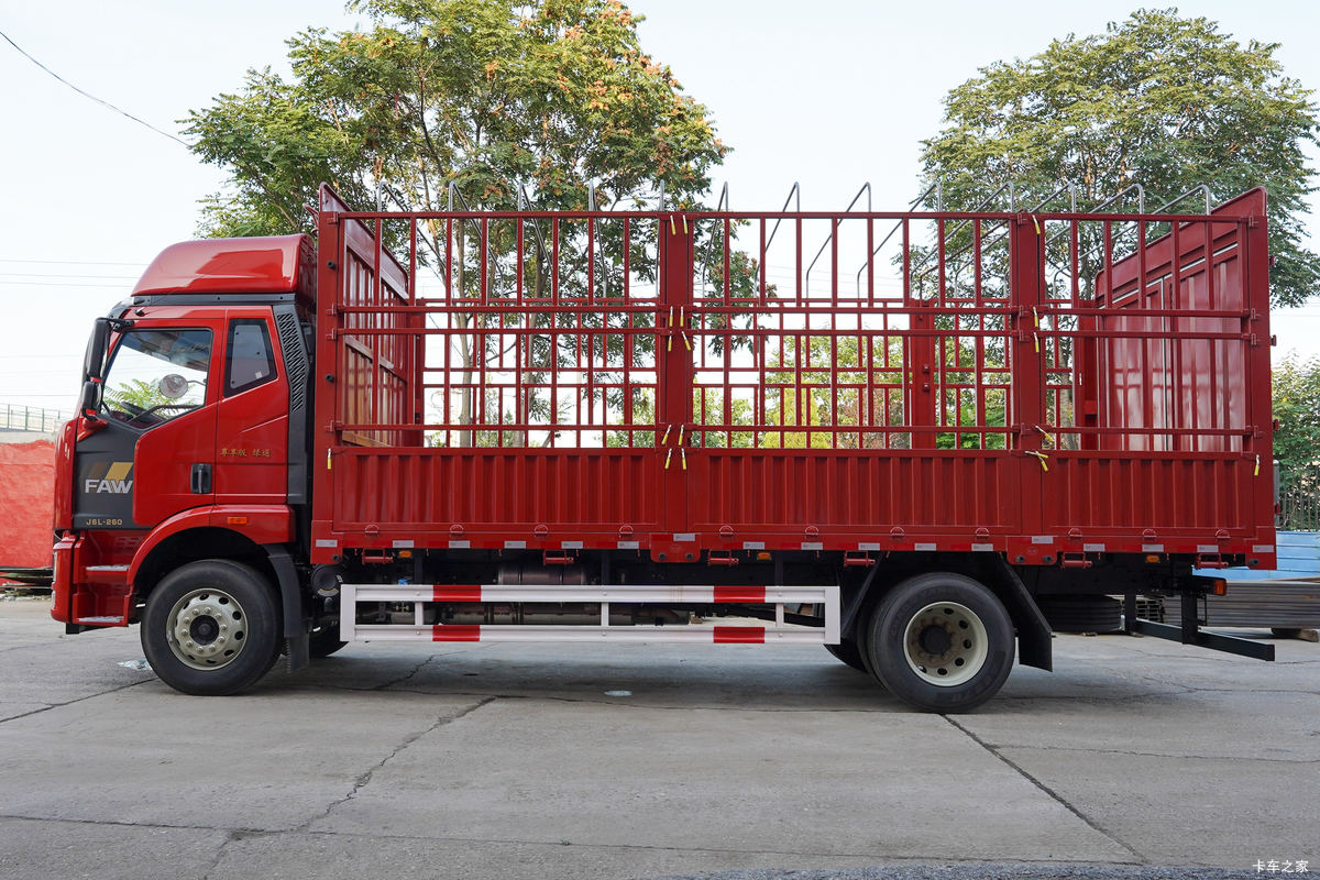 第三款是来自一汽解放的J6L 尊享版,这款车轴距为5300mm,车身尺寸为9x2.55x4米,大小适中,非常适合绿通的运营官工况。轻量化方面也不错,加上仓栅上装后,整车重量保持在6.9吨,额定载质量可达10.97吨。