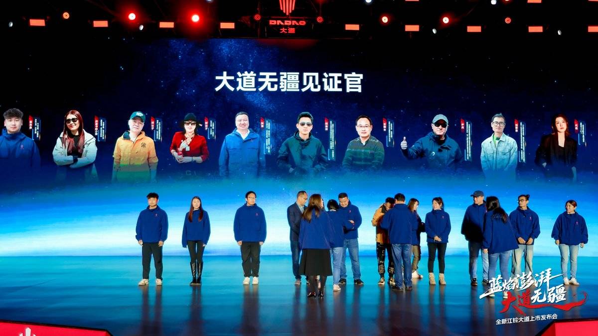 参与穿越挑战的车主代表驾驶全新江铃大道登台亮相。他们现场分享了从高原雪山到峡谷险滩、从容穿越炮弹坑与涉水路段的真实体验,全新江铃大道以全程零故障的稳定表现,赢得用户最朴实的信赖。为致敬这场无畏征程,江铃汽车授予十位车主代表"大道无疆见证官"荣誉,邱天高和熊春英现场颁发证书。