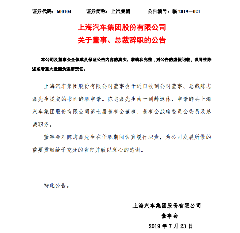 《上汽集团董事、总裁辞职,王晓秋接棒》