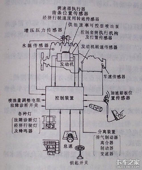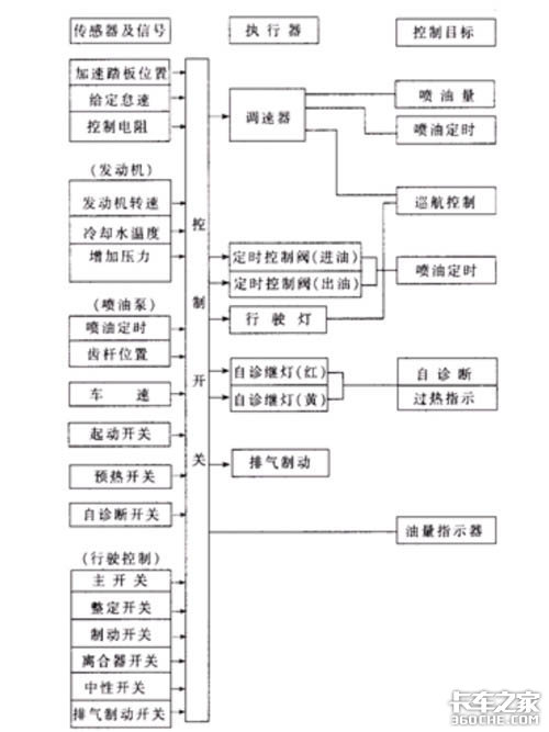 系统功能:预行程控制(供油速率、喷油提前角)喷油量控制,故障自诊断经济行程监控,自动控制车辆经济速度行驶等。