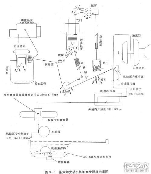 润滑油是从集油器经机油泵、机油滤清器至冷却器,进入主油道。在一般公路用车的发动机上使用单级齿轮泵,在越野车及工程机械上婕用双级齿轮泵。滤清器为两个全流式纸芯结构旋装式、水平对置并联安装。