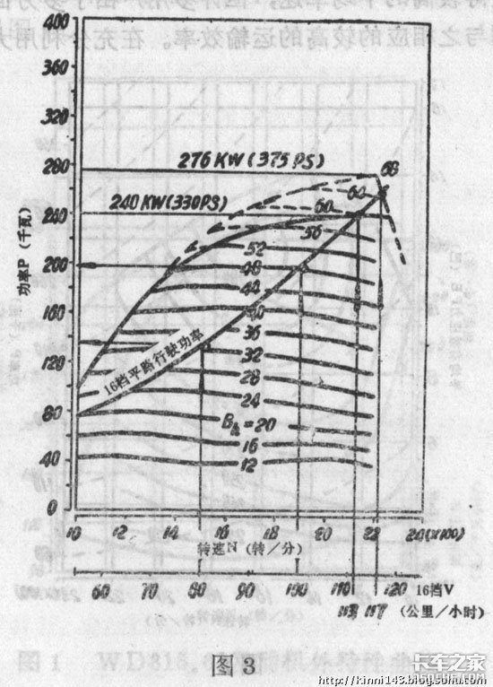 一辆38吨的半挂式汽车列车按照预定的行驶路线,在平路上用16档以80公里/小时的车速行驶时,功率相当于130千瓦,油耗量约为32升/小时,在车速提高到100公里/小时时,功率相当于200千瓦,可是油耗量却上升到48升/小时,净增50%!一辆发动机功率为276千瓦(375马力)的载重车(图3虚线所示)在平路上行驶虽然车速有可能达到120公里/小时左右,但与一辆车速约为113公里/小时、装用240千瓦(330马力)发动机的汽车相比,前者油耗量为68升/小时,而后者仅为60升/小时。