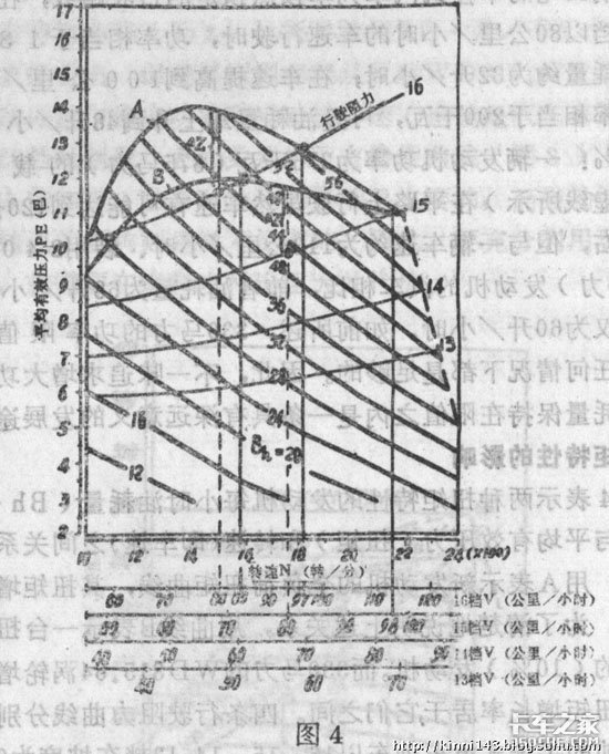 图4表示两种扭矩特性的发动机每小时油耗量(Bh一升/小时)与平均有效压力(扭矩)和转速(即车速)之间关系的万有特性。用A表示新发动机的全负荷扭矩曲线,其扭矩增长率为30%。为了清楚地说明上述关系,用曲线B表示一台扭矩增长率低的(10%)发动机。而330马力的WD815.64涡轮增压发动机的扭矩增长率居于它们之间。四条行驶阻力曲线分别表示~辆38吨的半挂式汽车列车以l6、15、14、13档在坡度为0.5%的路面上行驶时的阻力,各档相应的车速标在图4的下方。装扭矩特性较平坦的发动机B的车以16档行驶时,车速达到83公里/小时,油耗量为45.5升/小时,而用扭矩特性较陡的发动机A虽然车速可达97公里/小时,但其油耗量却为56.5升/小时,即每小时多耗油24%,或百公里油耗约增加3升。
