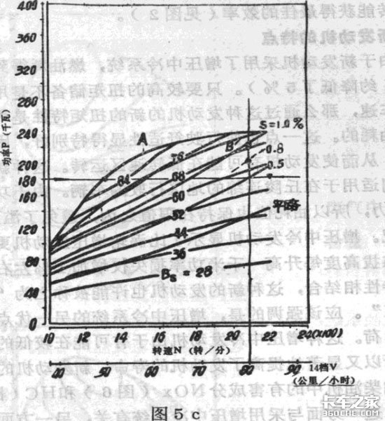 近来,用户多以“升/百公里”作为衡量汽车行驶一定里程的油耗单位。图5a—c表示百公里油耗Bs与发动机功率和转速(即挂16、15、14档时的车速)的关系(路面较平,坡度为0.5—1%)。