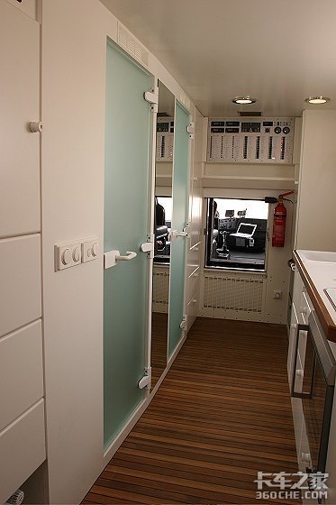 沿着爬梯进入车厢,你将立刻被其周到细致的室内设计和高超有效的空间利用率所征服,与其说它是一个“厢式客房”,不如说成是一个“移动别墅”。车内布置大体可分为四部分:宽大的卧室,周全的淋浴间,别致的客厅和开放式厨房。