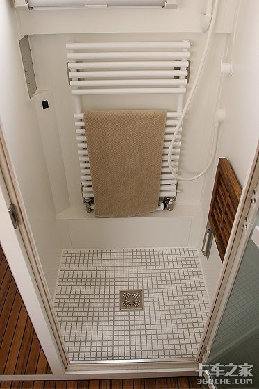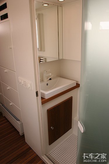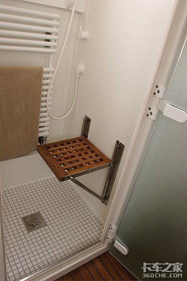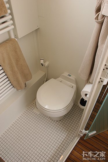 整车的浴室设计也合理而周到。在这个排风系统与取暖设施一个都不缺的小空间里,居然能精巧而不显丝毫凌乱地安放着淋浴器、洗手池、化妆镜、马桶以及嵌在上方空间的储物柜,实在让人不得不佩服设计者的精湛技艺和高超水平。