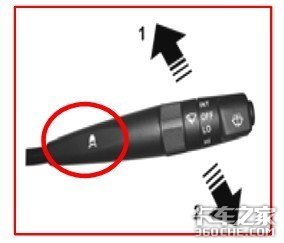 2、下长坡时,可单独开启排气制动,以降低下坡时的车速。操作方法是:将排气制动开关向前拨(图示1方向),松开油门和离合器踏板,排气制动便开始工作。在排气制动系统工作时,仪表板上排气制动指示灯点亮。当踩下油门或离合器踏板,可暂时解除排气制动。将排气制动开关向后拨(图示2方向),可关闭排气制动。