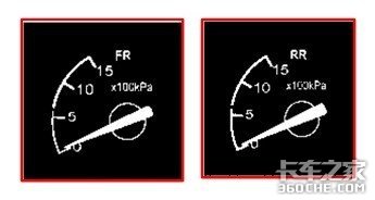 气压表:气压表指示贮气筒内的空气压力。前桥气压表(标有FR标志)检测前桥储气筒的压力,中、后桥气压表(标有RR标志)检测中、后桥储气筒的压力。