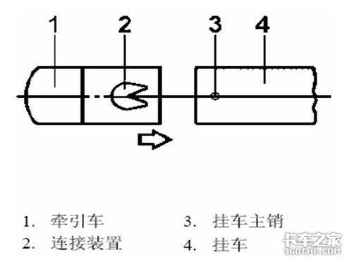 3、将连接装置基面的中心孔对好牵引主销后,使牵引车徐徐倒退,与挂车连接好。连接时,请按图所示,使挂车的中心线与牵引车的中心线互相对准。特别是挂车装货时,中心如不一致。支撑脚要承受过大的横向力,这是很危险的,请多加注意。