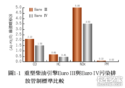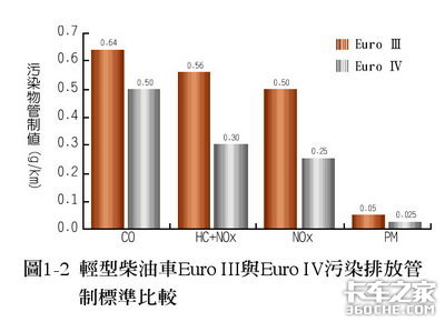 来卡车之家App由于地球环境日益恶化,环保议题也更加受到重视,欧美各国柴油车污染排放无不实施更严格之管制措施,以欧洲为例,其轻型柴油车PM排放管制EuroIV比EuroIII的管制量降低50%,NOx也降低50%;而重型柴油引擎PM排放管制则降低80%;NOx降低30%,如图1、图2所示。