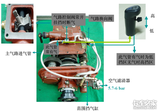 采用主、副箱组合设计,主箱(6个挡)手操纵,副箱(2个挡)气操纵。采用单H操纵装置。可根据用户要求配备离合器壳、分离装置总成等。轴向尺寸短,重量轻,承载能力大,头挡速比达15.53。使用可靠,维修方便,可采用底取力,前取力,后取力。