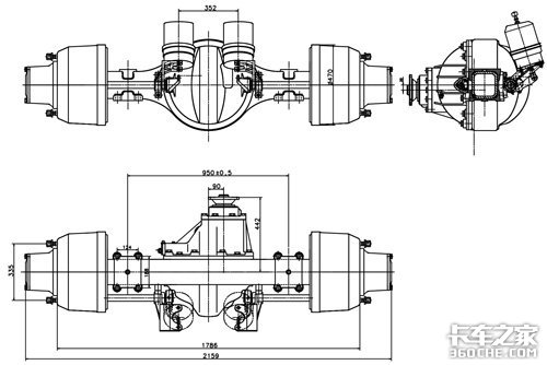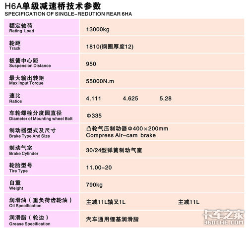 H6A桥的标定载荷13000Kg,最大输出扭矩55000N•m,可以匹配280~440马力的发动机。适用于作重型公路运输车。