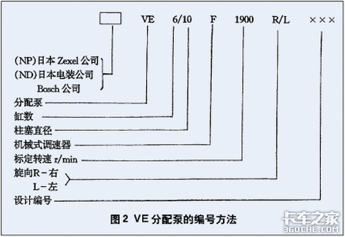 与直列泵相比,VE分配泵零件的加工精度要求较高,而且对材料材质和热处理的要求较严格,对柴油的清洁度的要求也较为苛刻。满足这些条件才能确保喷油泵的正常运转和应有的使用寿命。VE分配泵的基本技术规格如表2所示,其编号方法及其含义说明如图2所示。