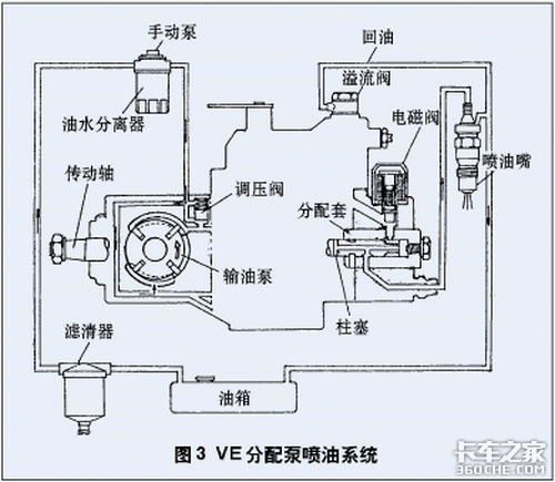 VE分配泵喷油系统的油路如图3所示。柴油机启动前,先用手动泵泵油,通过顶盖上的溢流阀排除柴油管路中的空气。柴油机运行时,由曲轴齿轮带动分配泵的传动轴。其前端的滑片式输油泵将柴油从油箱中抽出,经过柴油滤清器和油水分离器,滤掉柴油中的杂质和水份后进入输油泵,使柴油压力升高。