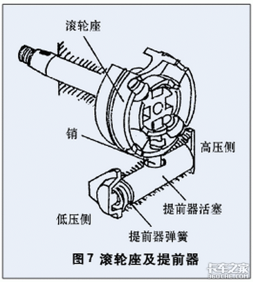 滚轮座上装有四个滚轮,通过圆柱销与提前器活塞联接。当泵体内柴油压力变化时,推动提前器活塞移动,带动圆柱销使滚轮座转动,改变滚轮与平面凸轮盘凸起的相对位置,从而达到改变供油提前角的目的。