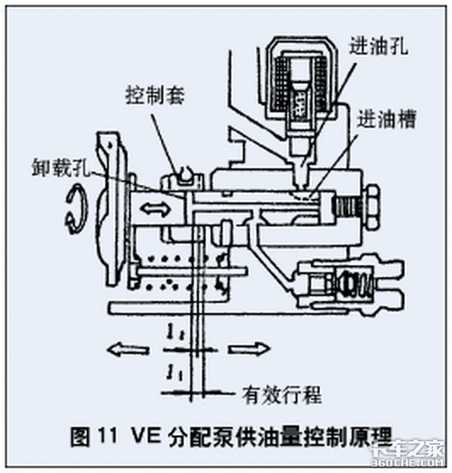 VE分配泵采用改变供油结束点相对凸轮的位置(即控制套筒的控制平面与柱塞上卸载孔的相对位置),来改变供油的有效行程(如图11所示)。