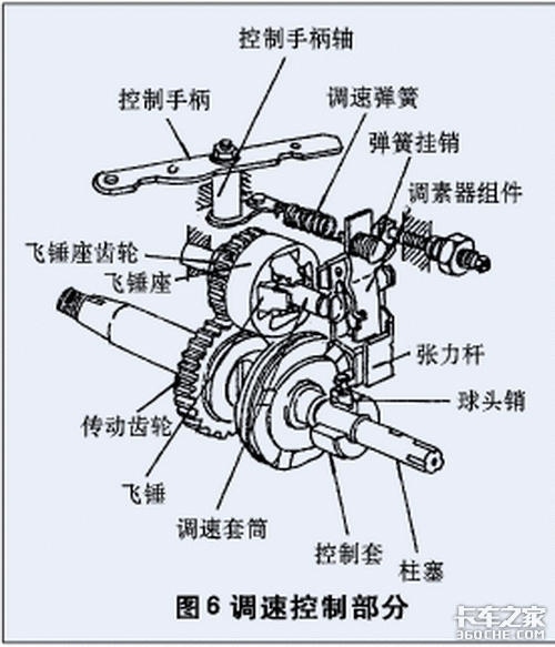 (2)调速控制部分(如图6所示)传动轴上的齿轮带动飞锤座和飞锤旋转,飞锤的离心力推动调速套筒轴向移动。经调速机构拨动柱塞上的油量控制套筒随转速变化而左右移动,改变其右侧棱边与柱塞上径向卸载孔的相对位置(如图4所示),从而达到随转速变化来控制供油量变化的目的。