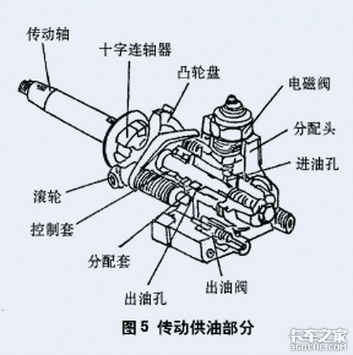 然后进入分配泵泵体内,再经过电磁阀进入柱塞腔。当柱塞向上运动时,压缩柴油产生高压,经柱塞中的油道和出油孔,分配到泵体上相应汽缸的油道,再经过出油阀、高压油管和喷油器喷入对应的汽缸。泵体内多余的柴油从顶盖上的溢流阀返回油箱。