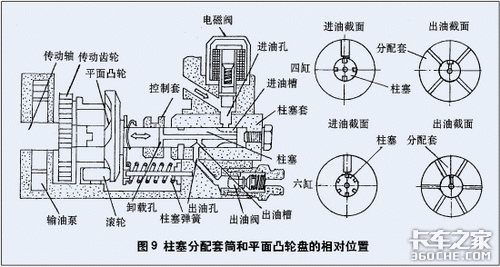 对于六缸柴油机而言,分配泵的平面凸轮盘上有六段凸轮型线,相互间隔60°;滚轮座中装有四个滚轮,但相互间隔分别为60°和120°。柱塞顶端有六条进油槽,而圆周上仍只有一条出油槽,相应的分配套筒上也有一个进油孔和六个出油孔。油泵传动轴每转过60°,柱塞就完成一次进油、压油和分配的供油过程。这样的供油过程重复六次,分配泵传动轴旋转一周。