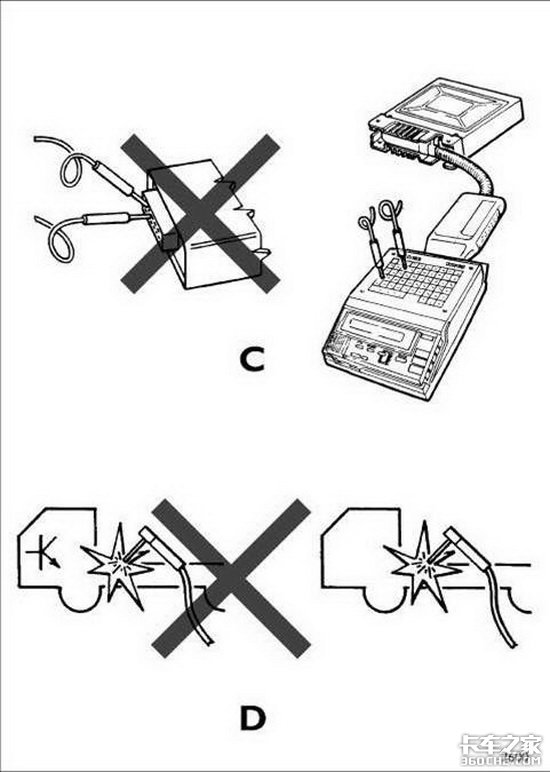 在连接时,拧紧接头的凸缘螺帽(温度及压力传感器…等)至所需的扭矩值。利用辅助卡车起动发动机时,应检查电瓶接线柱极性是否正确。进行车辆电器/电子系统的作业之前先断开电瓶的正极。断开电子控制单元的接头之前,先将系统隔离。切勿以引起火花的方式检查线路是否有电。切勿使用测试灯泡检查线路的导通性。只能使用适当的测试装置。切勿以车辆的额定电流直接供电给电子控制单元相关联的部件。