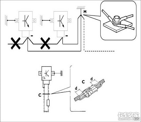 连接到系统接地点的负极导线越短越好,各导线彼此间以“星形”方式固定在锁点上,确实按照正确的顺序以及适当的方式进行紧固(参考图1,M点)。此外,电子部件必须小心遵照以下指示: