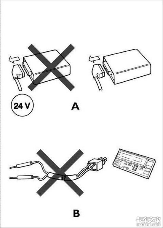 确认电子装置的接线(长度、线材种类、位置、编组、屏蔽层编制物的连接、接地……)均符合IVECO系统规范,且在维修或保养作业后均小心恢复原状。为了避免车上电子系统可能发生故障,附加装置的接线方式必须与上述系统有所区别。切勿将附加系统的负极端子与电子系统的负极端子连接。在车上进行电焊作业时,请断开所有电子控制单元及(或)断开电瓶正极端子的电源线并连 接到车架接地上。