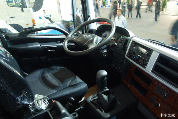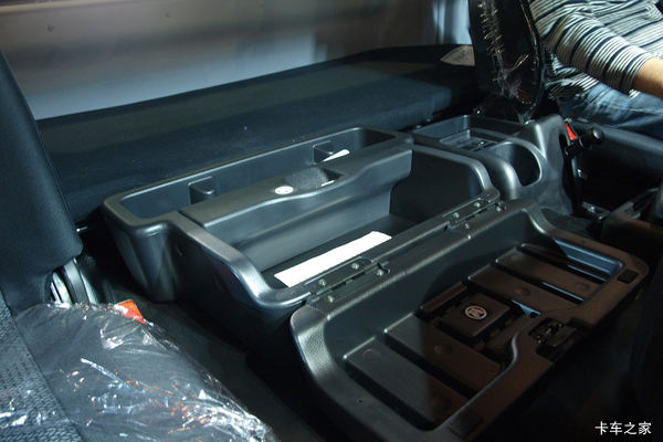 整个仪表台以黑色为主色调,间以仿胡桃木装饰板,中规中矩。仪表盘采用传统的半圆形造型,表盘上的数字、指针、刻度线要比其他重卡大不少,看上去有点“单调”,但很实用。主要的开关都设置在转向盘下方便于驾驶员操作的地方。广汽日野700将中控台的空间利用到极限,除了音响、空调、预留按键开关外,还设计了4个开放式的储物盒。烟缸的位置和很多重卡不同,有点像早期的轿车,放在了两侧的车门上。牵引车与挂车的手制动使用同一个手柄,在手制动手柄旁边有一个小型储物盒,可以放置水杯、证件和一些日常用品。
