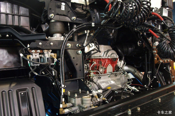 当然,空间是有限的,为了获得大的卧铺空间,广汽日野700多少还是牺牲了仪表台的宽度及驾驶室顶部的储物空间,在正副驾驶座椅之间的一个大储物盒算是一种弥补,其实,使用频率不高的上卧铺也可以储物用。广汽日野700紧凑的内饰设计,确实做到了“多一分嫌肥,少一分则瘦”。这种设计思路在整个底盘的布置上也是如此。左侧有限的空间内硬是塞进了4个储气罐、一对电瓶、一条备胎,右侧则是一个420 L的油箱和方形消声器。