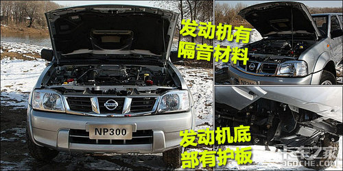 郑州日产NP300发动机舱布局比较规整,采用了双电瓶的设计,保障其在恶劣条件的正常工作。发动机盖上装有较厚的隔音棉。在车头部分发动机下方我们发现了保护油底壳的护板,这显然是一项比较细腻的配备,通过它可以有效的避免路上飞起的石子或凹凸不平的路面,对发动机下方以及车体下部造成伤害。