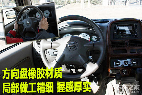 郑州日产NP300方向盘体现出了大气,具有越野车的风格,方向盘材质为橡胶包裹,使用中手感非常舒适。做工非常精细。