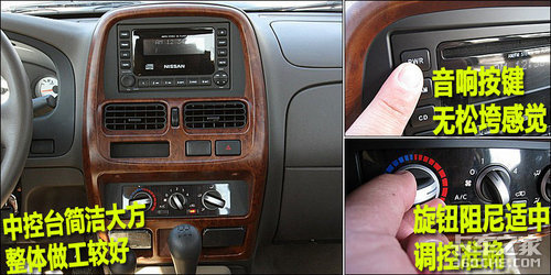 郑州日产NP300的中控台面板采用了深色设计风格,属于时尚、简洁的类型。中控台的各按键、旋钮在使用中各项调节功均能准确到位,音响控制面板按键大小适中,方便乘客操作。