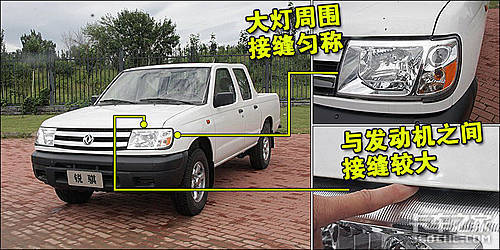 东风锐骐基本上抛弃了皮卡一贯的“货车脸”,车身线条钢劲有力,双横式镀铬格栅位于两侧前大灯中间,使车头的整体感更强。另外,车身涂装工艺的精细度、光亮度也表明了其要比其它皮卡高出一个档次。大灯部分与保险杠、发动机盖、水箱框架等周围的接缝非常匀称,但接缝较大。