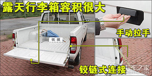 东风锐骐的后车箱门为上拉式设计,但力度很大,使用时比较费力气。后车箱容积很大,1395mm×1390mm×430mm的后车箱轻松的装上将近500kg的货物。