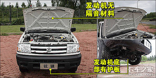 东风锐骐发动机舱布局比较规整,发动机盖上装无隔音棉。在车头部分发动机下方我们发现了保护油底壳的护板,这显然是一项比较细腻的配备,通过它可以有效的避免路上飞起的石子或凹凸不平的路面,对发动机下方以及车体下部造成伤害。