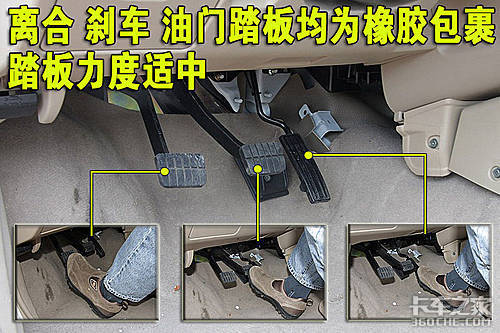 东风锐骐的离合、油门和刹车踏板均为橡胶包裹。刹车踏板行程较短,并且很灵敏。
