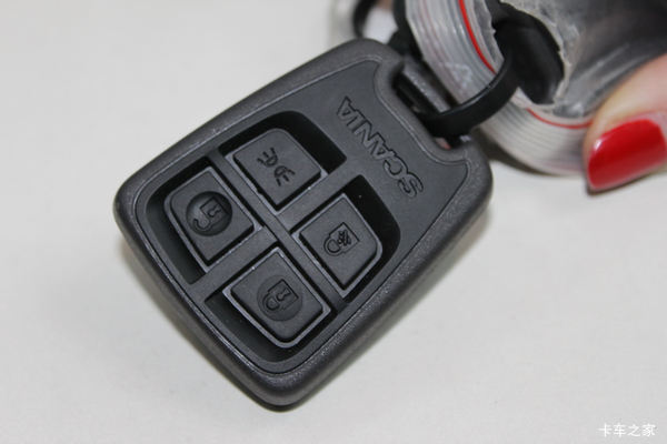 本车提供两套完整的钥匙,其中包括两把钥匙,两个遥控器。斯堪尼亚的遥控器很有意思,大家注意那个灯光按钮,可以实现单人检查全车灯光,你只要拿着钥匙按该按钮,全车的各种灯光便会按顺序点亮,从而可以在出车前做仔细的检查,再也不用一个人在驾驶室操作,一个人检查了。