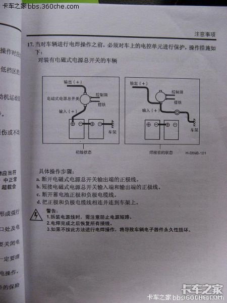 但今天我在翻阅该使用车册的时候看到了说明书中明显的提示到使用电磁式电源总开关的车辆进行电焊作业时的注意事项!对此我专门打电话问了经销商,得到的答复是随车配套的使用说明就有些存在这种不符合的现象,作为用户对此我感到非常的气愤,这完全是对用户不负责任!就算经销商在卖出车辆时没有告之这么重要的注意事项,但至少相对应配发的使用说明书应该符合售出车辆的型号。
