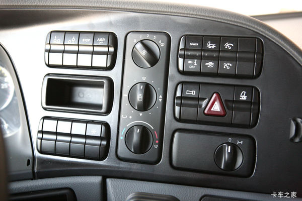 在仪表盘的右侧,同样是一组控制按钮,除了中间的空调控制,主要还是对车身行驶安全方面的,包括后桥的提升,ASR(牵引力控制系统),右上角是应对不同路况的控制按钮。