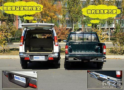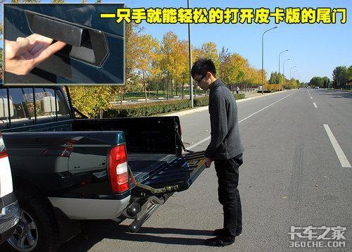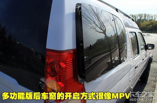 锐骐皮卡版和多用途版车型的尾门由于设计的不同,开启方式也是略有区别。多用途版的尾门可以采用选择掀起方式打开,而且内部的隔板也可以掀起,方便了前后排乘客的交流。而皮卡则只是一个简单的“斗儿”,不过值得一提的是这款车配备了原厂保险杠,并且增加了防装粱。