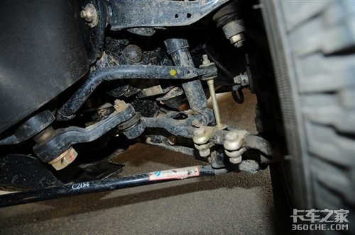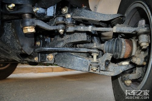 皮卡版的锐骐是两驱车型,而白色的商用版锐骐则是四驱车。两者的区别除了四驱系统多了分动箱和前传动轴以外,最大的应该是前桥系统的不同了;四驱锐骐的前桥是上下A臂结构,传动轴从两者之间穿过给前轮提供动力,而2驱车型的前桥则是由上A臂和一个单臂式的下支臂加拉杆组成,很显然这样做的成本会更低,而且只作为转向轮的前轮也并不需要4驱车那样复杂的悬架结构。至于后桥两者都是相同的板簧式结构。