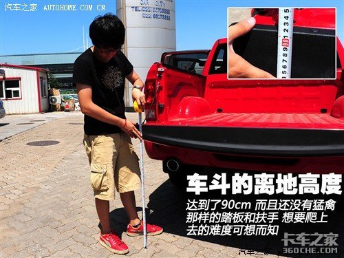90cm的离地高度足有半人多高,所以如果是往上搬东西那绝对是一件比较悲剧的事情。同样悲剧的是如果你东西比较多,想把搬上来的东西往里推推,那你就不得不爬上来,而它可没有像F-150那样提供上下的踏板和扶手,记得罗浩从美国回来时告诉我很多开大皮卡去超市采购的都是爷爷奶奶级的,我想要不就是他骗了我,要不就是美国的爷爷奶奶腿脚真的很利索,难道是集体补的钙吗。