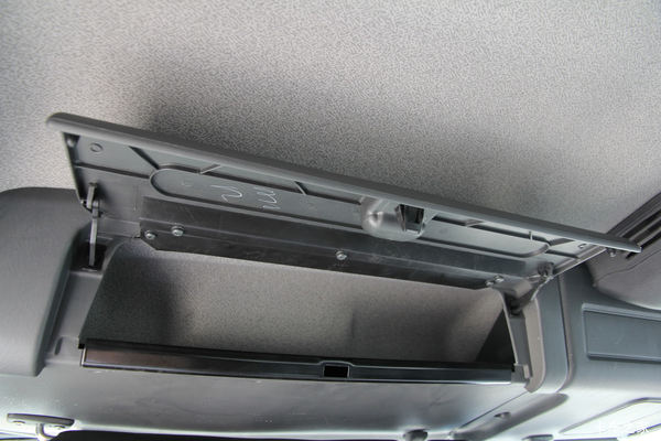 驾驶室顶部有两个储物格,空间不是很大,只能放一些小的物件,但也算是充分利用了驾驶室的空间吧。