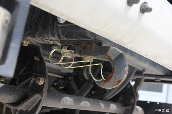 车辆的保险钩向下,比较粗壮,下面带有防脱落机构,防止在拖车的过程中拖绳脱落。