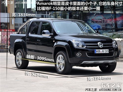 或许是途锐看多了让我产生这种错觉,这也不足为奇,但我确信这与它的车身尺寸也有着直接的关系。长*宽*高为5254*1944*1834(mm)的大众Amarok明显是皮卡里面的小个子。虽然它比途锐要大一点,但比福特F-150的最小版本(普通货箱短驾驶室版,长5364mm)却是小了一圈,那就更不用拿它跟福特F-450相比了。