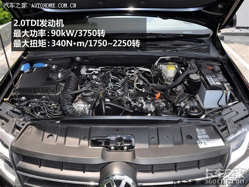 据资料显示,大众Amarok在国外销售的车型一共有3款发动机可选,分别是2.0TSI汽油发动机、2.0TDI柴油发动机和2.0BiTDI柴油发动机,而这次实拍的是2.0TDI柴油发动机车型。这款发动机在转速达到3750转的时候可以输出最大功率90kW;在1750-2250转的转速区间均能输出340N·m的最大扭矩,与这款发动机搭配的是6挡手动变速箱。