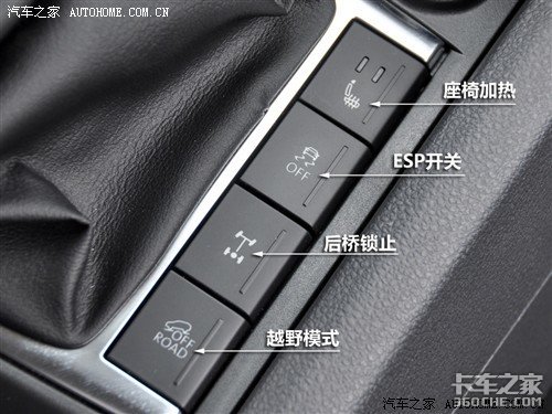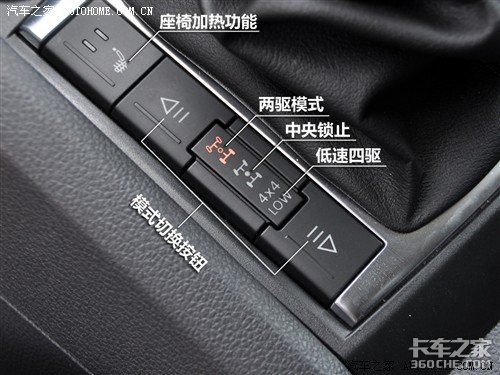 实拍的大众Amarok为四驱版本车型,配备了大众的4MOTION系统,这套四驱系统的控制按钮设置在挡把的两则。从图片上的功能来,这套四驱系统可以实现两驱模式、中央锁止功能、低速四驱模式、后桥锁止功能。另外,它还预设了一个OFF ROAD的越野模式,让你到郊外撒野变得更加轻松。