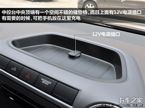 从实拍的照片可以看到,大众Amarok的车内储物格比较丰富,已经可以应付到日常使用的需求,而且大部分储物格的人性化出色,例如中控台顶端的梯形储物格。它不仅有着不错的储物空间,而且上面还备有一个12V的电源插口。在有需要的时候,可以把手机放在这里充电。