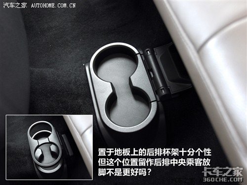 另外一个设计十分有个性的地方就是后排的杯架,它就置于后排的地板上,顶层的固定架可以收藏起来。这是否人性化我不知道,但我个人认为这个位置留给后排中央乘客用来放脚用会更好一些。